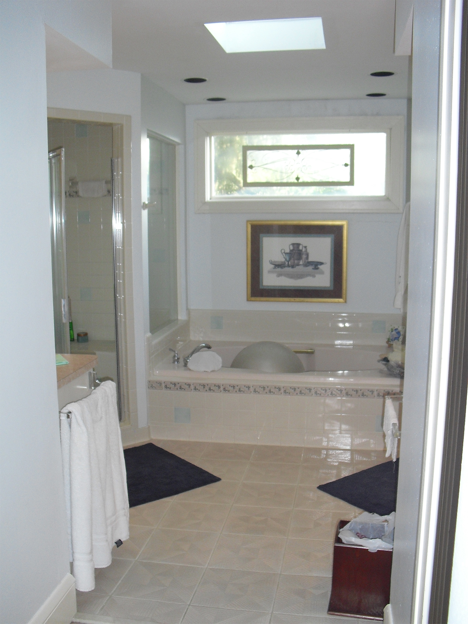 In addition to the master bath remodel, we replaced windows in the den, refinished the front door, replaced the fireplace surround with marble, and replaced the rear entry door and sidelights with a three-quarter glass to allow more light into the rear entry.